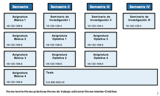 El alumno debe cursar 24 créditos en asignaturas básicas y 24 créditos en asignaturas optativas y 12 créditos en tres seminarios de Investigación. La selección de las asignaturas básicas y optativas se realiza en función del tema de tesis.